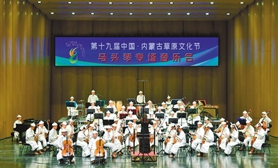 在第十九屆中國(guó)·內(nèi)蒙古草原文化節(jié)馬頭琴專場(chǎng)音樂會(huì)上,中國(guó)烏審馬頭琴交響樂團(tuán)演奏《草原歡歌》。音樂會(huì)分為上半場(chǎng)和下半場(chǎng),分別由烏審馬頭琴交響樂團(tuán)和齊·寶力高野馬馬頭琴樂團(tuán)演奏,為觀眾開啟氣勢(shì)磅礴富有草原文化特色的音樂之旅。記者 王磊 攝