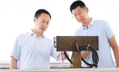 于志永(左)調(diào)研水質(zhì)提升改造項目,查看儀器運行。 (圖片由海南區(qū)融媒體中心提供)