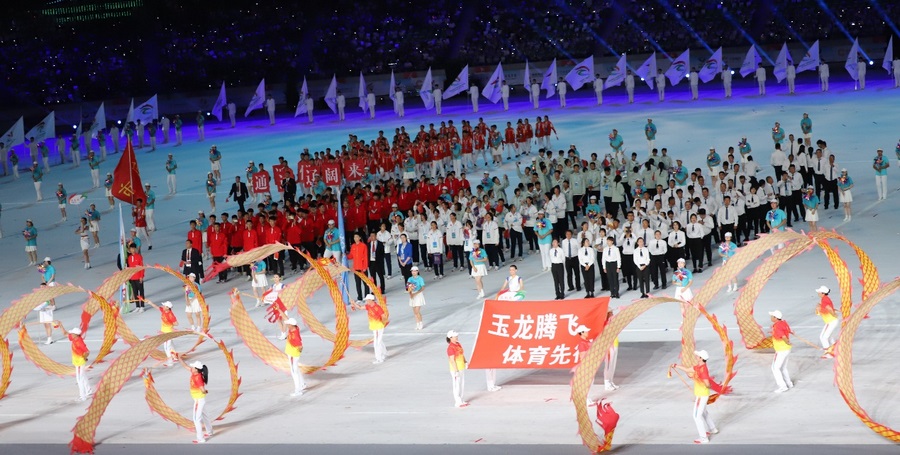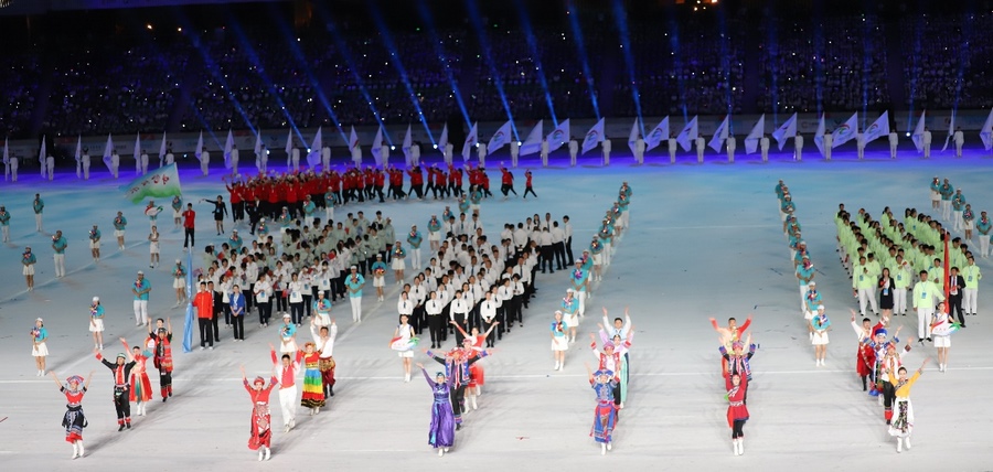 入場儀式結(jié)束后,在雄壯的國歌聲中,鮮艷的五星紅旗冉冉升起,在體育中心上空迎風飄揚。期盼的眼神,真摯的祝福,蕩漾在每個人的心間。開幕式文體展演隨后正式拉開帷幕。
