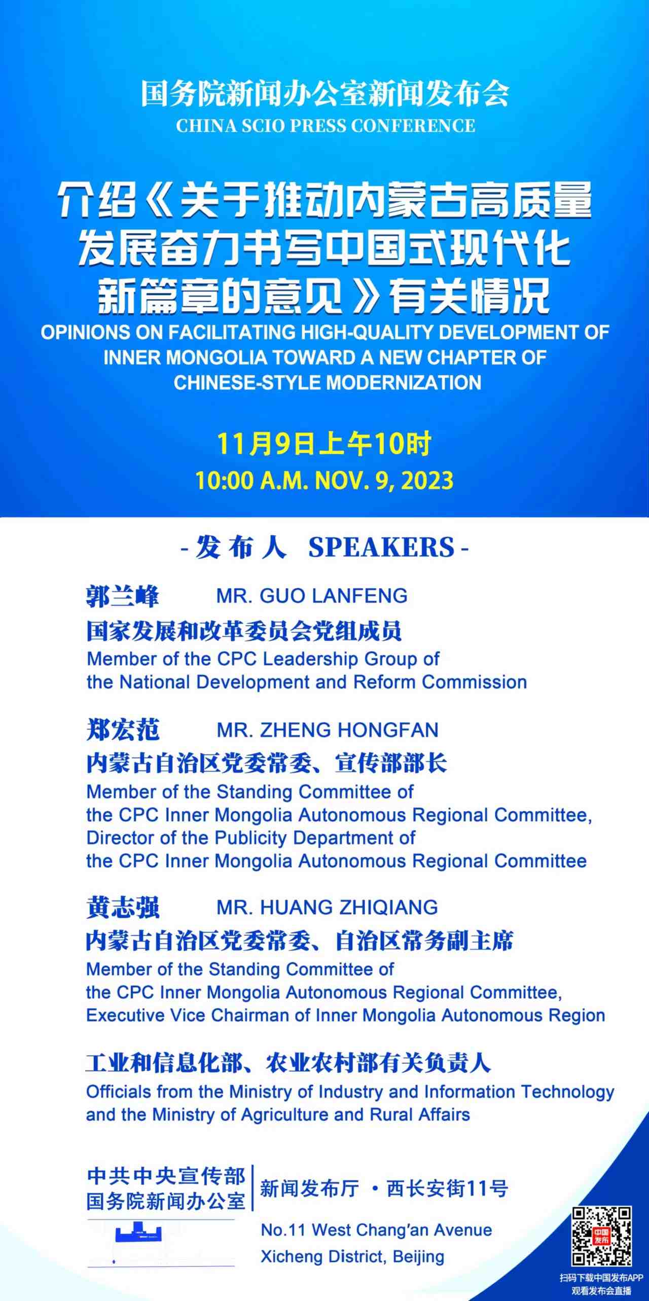 2023年11月9日(星期四)上午10時(shí),國務(wù)院新聞辦公室舉行新聞發(fā)布會,請國家發(fā)展和改革委員會黨組成員郭蘭峰,內(nèi)蒙古自治區(qū)黨委常委、宣傳部部長鄭宏范,內(nèi)蒙古自治區(qū)黨委常委、自治區(qū)常務(wù)副主席黃志強(qiáng)和工業(yè)和信息化部、農(nóng)業(yè)農(nóng)村部有關(guān)負(fù)責(zé)人介紹《關(guān)于推動內(nèi)蒙古高質(zhì)量發(fā)展奮力書寫中國式現(xiàn)代化新篇章的意見》有關(guān)情況,并答記者問。