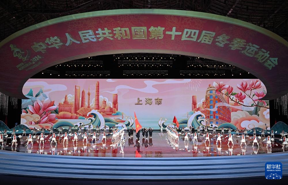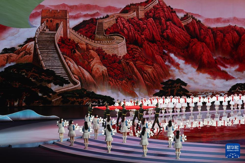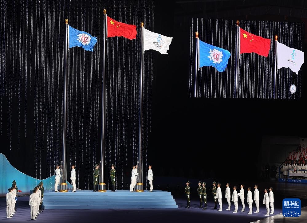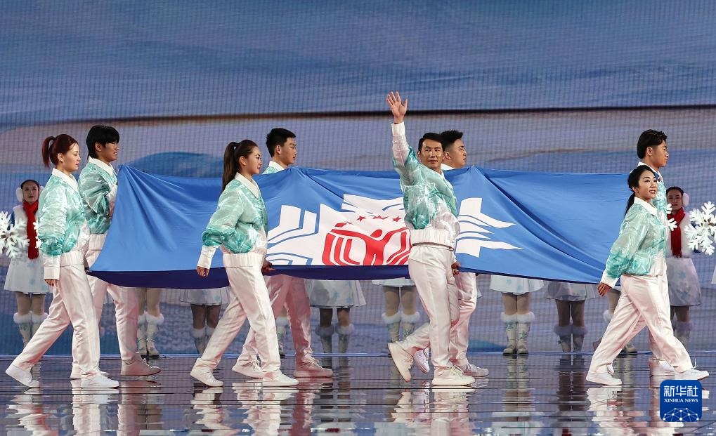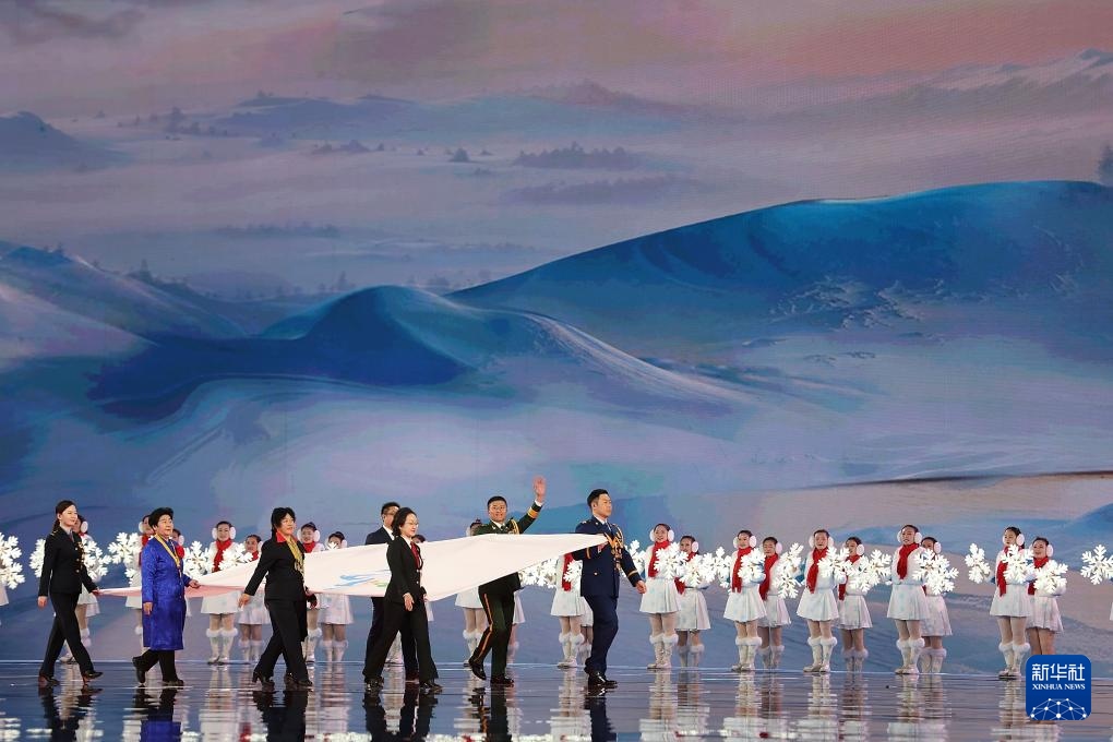 ??2月17日,中華人民共和國第十四屆冬季運動會會旗在開幕式上入場。新華社記者 黃偉 攝
