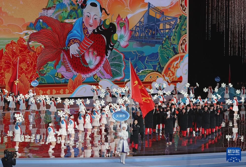 ??2月17日,天津市體育代表團在開幕式上入場。新華社記者 姜帆 攝