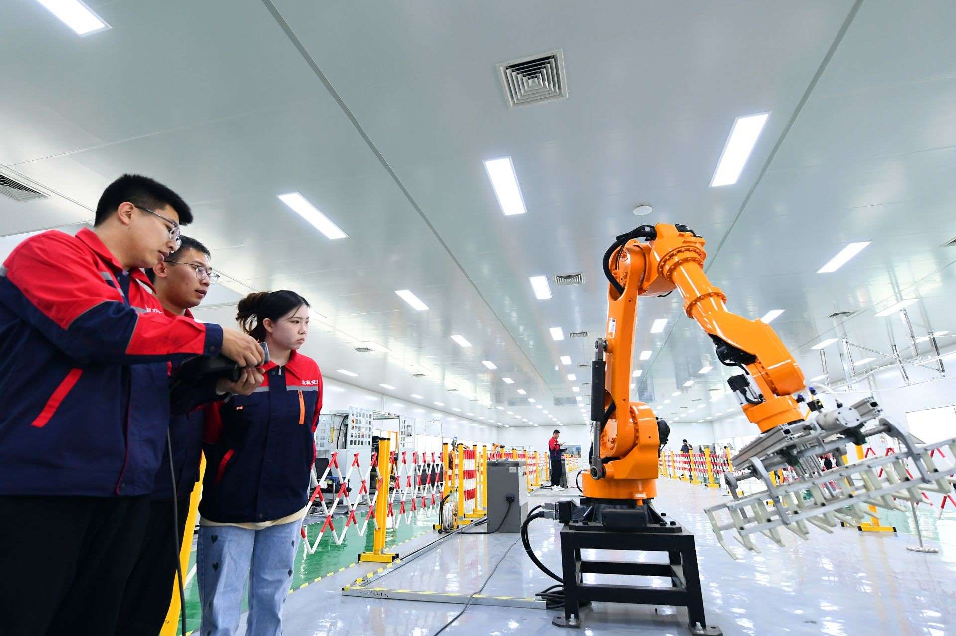 包頭稀土高新技術產(chǎn)業(yè)開發(fā)區(qū)高新技術特色產(chǎn)業(yè)基地北科交大機器人展廳,工作人員正在調試碼垛轉運六軸機器人。草原全媒記者金泉攝