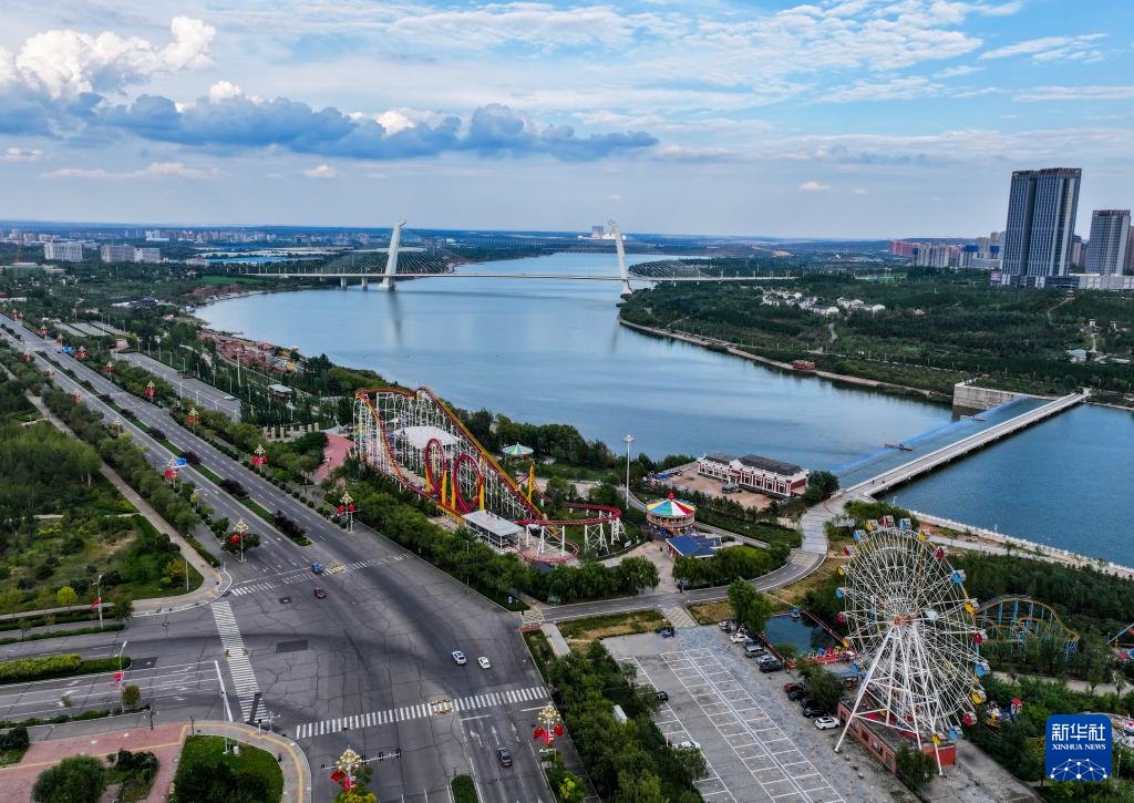 ??這是9月19日拍攝的鄂爾多斯市康巴什區(qū)烏蘭木倫湖與百康橋(無(wú)人機(jī)照片)。