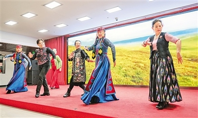 11月12日,烏蘭牧騎隊(duì)員在北京市西城區(qū)德勝街道辦事處與群眾一同跳舞。當(dāng)日,內(nèi)蒙古自治區(qū)直屬烏蘭牧騎攜包頭市達(dá)茂旗烏蘭牧騎、鄂爾多斯市伊金霍洛旗烏蘭牧騎開展“紅色文藝輕騎兵 烏蘭牧騎在北京”——北疆文化神州行文藝演出活動(dòng)。據(jù)了解,此次烏蘭牧騎進(jìn)京演出活動(dòng),從11月6日至17日,在北京的民族文化宮為觀眾奉獻(xiàn)33場精彩的演出,同時(shí)還將走進(jìn)社區(qū)和學(xué)校開展多場演出活動(dòng)。 (記者 王磊 攝)