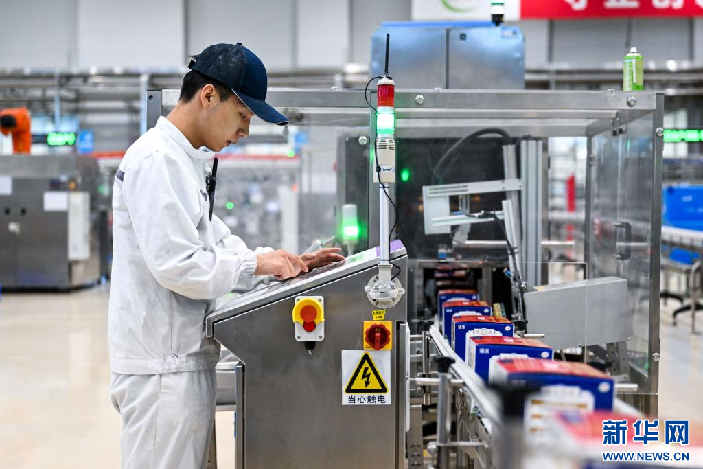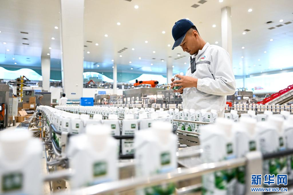 1月9日,在呼和浩特市伊利現(xiàn)代智慧健康谷液態(tài)奶全球智造標桿基地,工人在生產(chǎn)線上檢查奶制品包裝情況。
