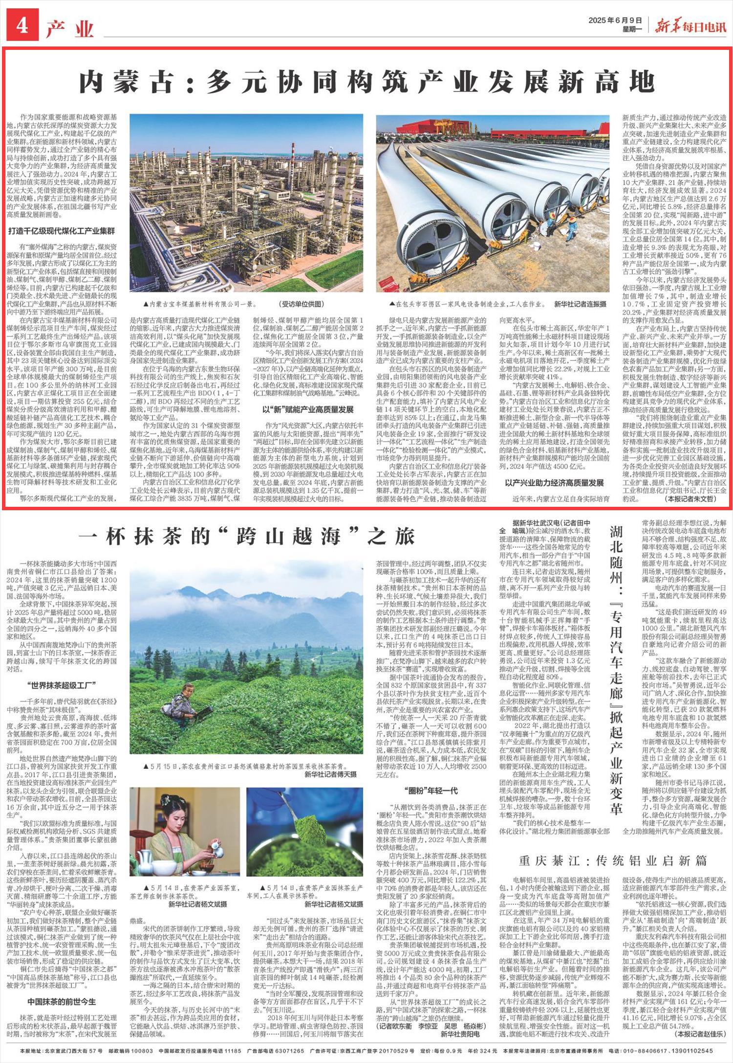 2025年6月9日《新華每日電訊》第4版刊發(fā)了《內(nèi)蒙古:多元協(xié)同構筑產(chǎn)業(yè)發(fā)展新高地》的文章,報道了內(nèi)蒙古依托深厚的煤炭資源大力發(fā)展現(xiàn)代煤化工產(chǎn)業(yè),構建起千億級的產(chǎn)業(yè)集群。憑借資源優(yōu)勢和精準的產(chǎn)業(yè)發(fā)展戰(zhàn)略,內(nèi)蒙古正加速構建多元協(xié)同的產(chǎn)業(yè)發(fā)展體系,在祖國北疆書寫產(chǎn)業(yè)高質(zhì)量發(fā)展新畫卷。