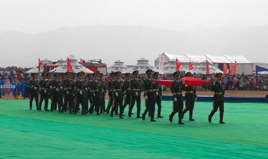 2025阿拉善那達慕開幕式上儀仗隊護送國旗走向場地