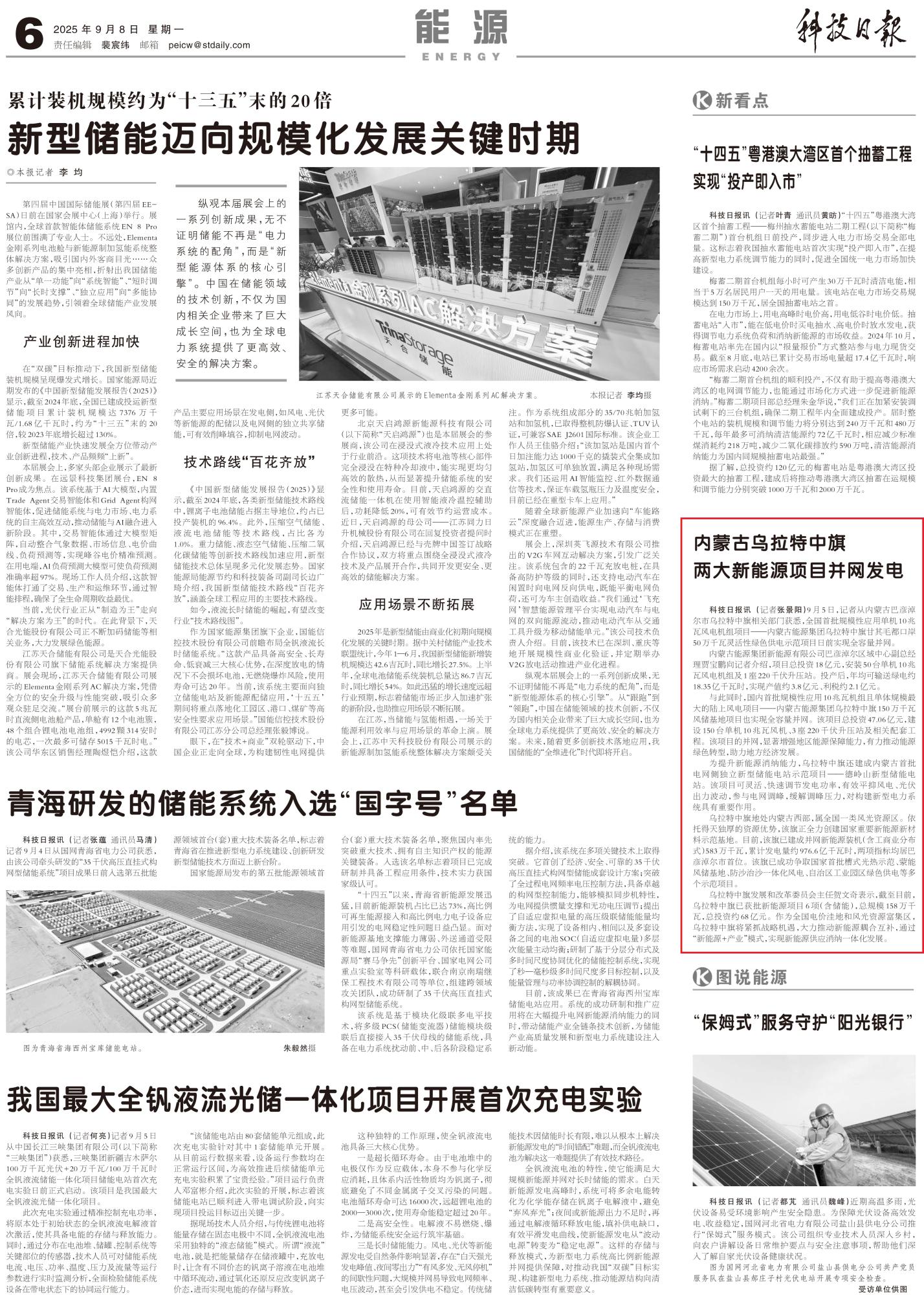 2025年9月8日,《科技日報(bào)》第6版整版刊發(fā)題為《內(nèi)蒙古烏拉特中旗兩大新能源項(xiàng)目并網(wǎng)發(fā)電》的文章,報(bào)道了記者從內(nèi)蒙古巴彥淖爾市烏拉特中旗相關(guān)部門獲悉,全國首批規(guī)模性應(yīng)用單機(jī)10兆瓦風(fēng)電機(jī)組項(xiàng)目——內(nèi)蒙古能源集團(tuán)烏拉特中旗甘其毛都口岸50萬千瓦靈活性綠色供電示范項(xiàng)目日前實(shí)現(xiàn)全容量并網(wǎng)。