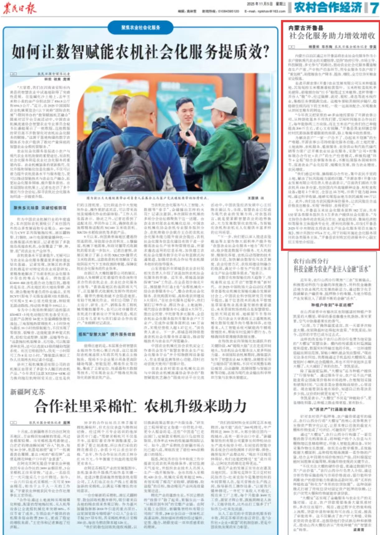2025年11月5日,《農(nóng)民日?qǐng)?bào)》第7版刊發(fā)題為《內(nèi)蒙古開魯縣:社會(huì)化服務(wù)助力增效增收》的文章,報(bào)道了今年以來(lái),內(nèi)蒙古開魯縣玉米社會(huì)化服務(wù)面積182萬(wàn)畝,共有132家各類服務(wù)組織為3萬(wàn)多農(nóng)戶提供社會(huì)化服務(wù)。