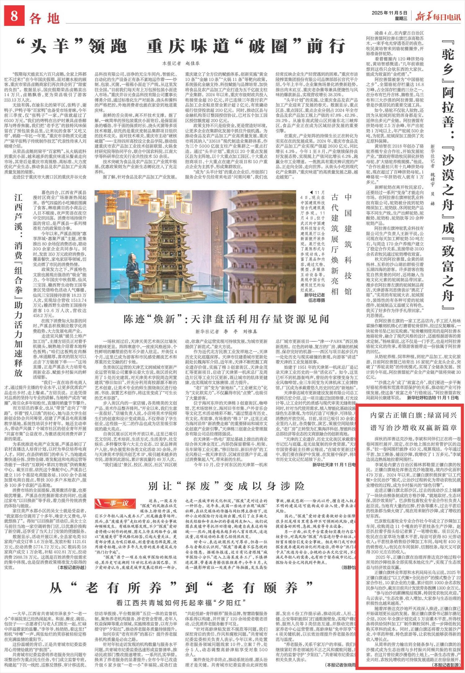2025年11月5日,《新華每日電訊》第8版刊發(fā)題為《內(nèi)蒙古正鑲白旗:綠富同興譜寫治沙增收雙贏新篇章》的文章,報(bào)道了2024年以來,內(nèi)蒙古正鑲白旗積極探索“以工代賑+全民治沙”模式,讓治沙過程轉(zhuǎn)化為帶動(dòng)農(nóng)牧民就業(yè)增收的過程,成為鄉(xiāng)村振興的“綠色引擎”。