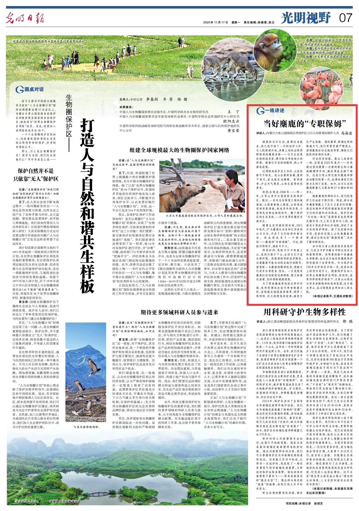 2025年11月17日,《光明日報(bào)》第7版刊發(fā)題為《當(dāng)好麋鹿的“專職保姆”》的文章,以內(nèi)蒙古大青山國家級自然保護(hù)區(qū)白石頭溝管理站管護(hù)人員馬海波的視角,講述當(dāng)好麋鹿的“專職保姆”的故事,如今白石頭溝的麋鹿數(shù)量已從最初的27頭增加到60多頭。