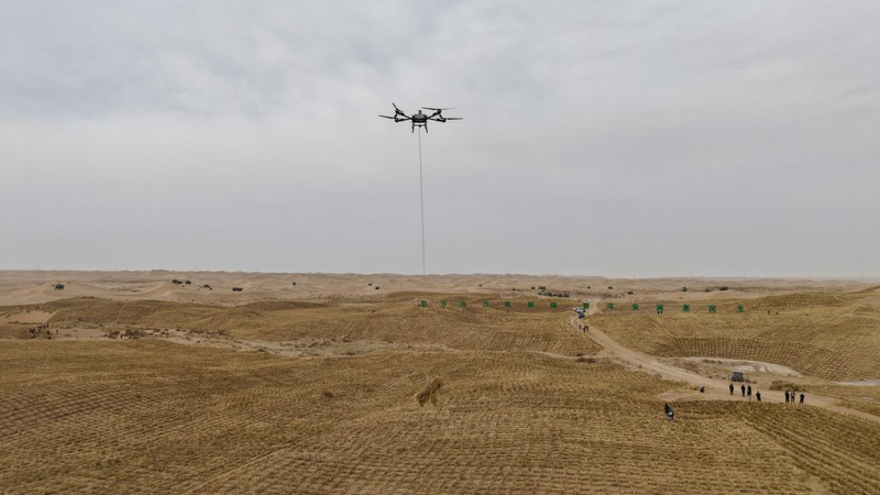 當(dāng)日上午10時,在黃河“幾字彎”西岸的項目現(xiàn)場,工程車輛整齊列隊蓄勢待發(fā),治沙工作者與建設(shè)人員精神抖擻,處處涌動著起步即沖刺、實(shí)干勇爭先的奮斗熱潮。隨著響亮的“開工”令下,現(xiàn)場機(jī)械轟鳴,打樁機(jī)精準(zhǔn)作業(yè),無人機(jī)吊運(yùn)草料,手扶式沙障機(jī)忙著扎設(shè)草方格……阿拉善盟“十五五”時期生態(tài)建設(shè)的首場戰(zhàn)役——2026年“三北”六期工程攻堅戰(zhàn)全面打響。