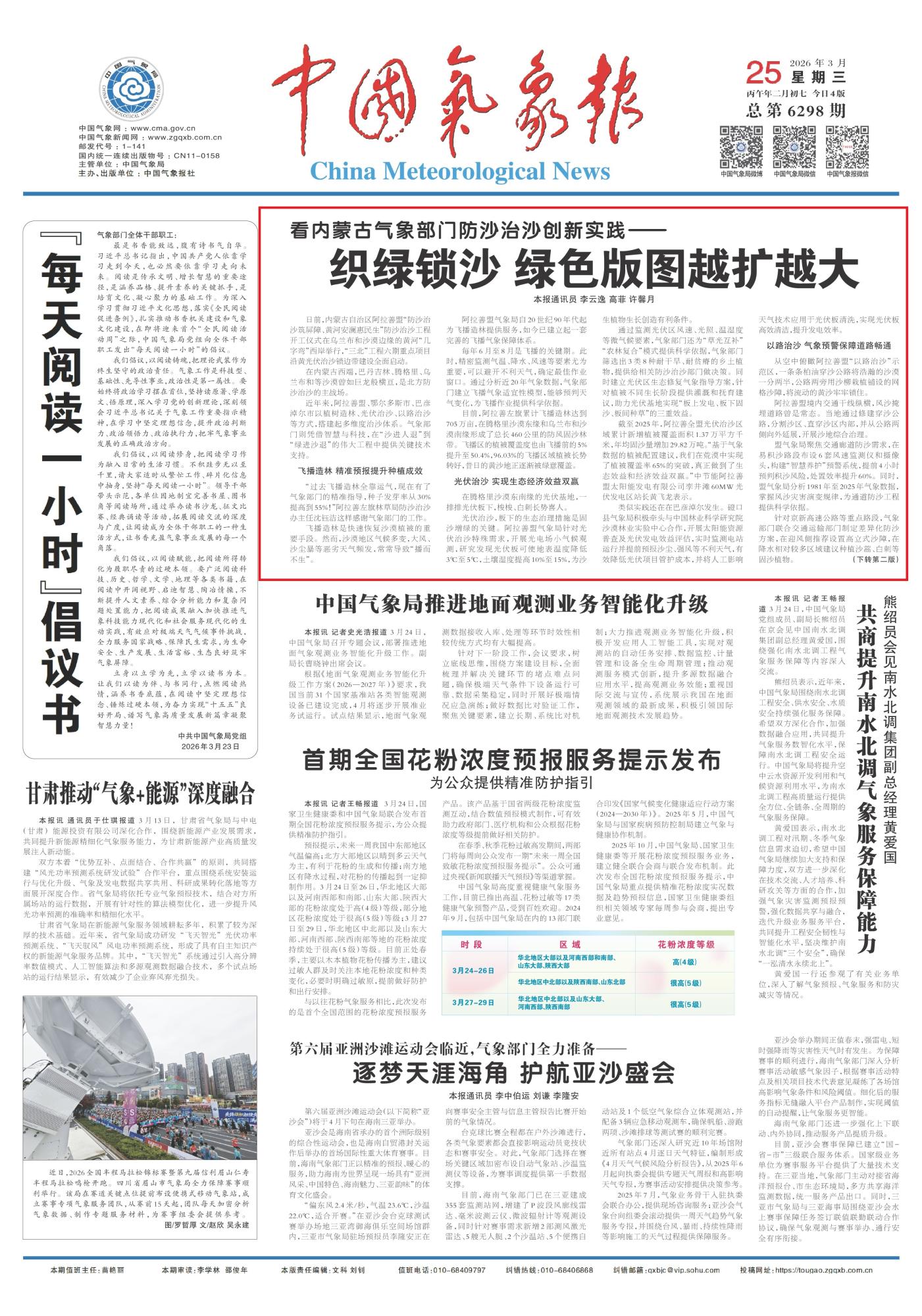 2026年3月25日《中國氣象報》第1版刊發(fā)了《看內(nèi)蒙古氣象部門防沙治沙創(chuàng)新實(shí)踐—織綠鎖沙綠色版圖越擴(kuò)越大》的文章,報道了內(nèi)蒙古阿拉善盟啟動沿黃光伏治沙等“三北”六期防沙治沙重點(diǎn)工程,氣象部門精準(zhǔn)賦能飛播造林、光伏治沙、以路治沙三大模式,提供全流程技術(shù)支撐,大幅提升治沙成效與生態(tài)經(jīng)濟(jì)效益,筑牢北方生態(tài)安全屏障。