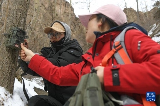 2月20日,在內(nèi)蒙古賀蘭山國家級自然保護區(qū),工作人員阿麗瑪(左)和徐皓在布設紅外相機。