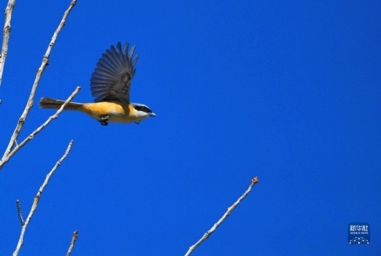 灰背伯勞在拉薩市城關(guān)區(qū)蔡公堂街道次角林村上空飛過(5月14日攝)。