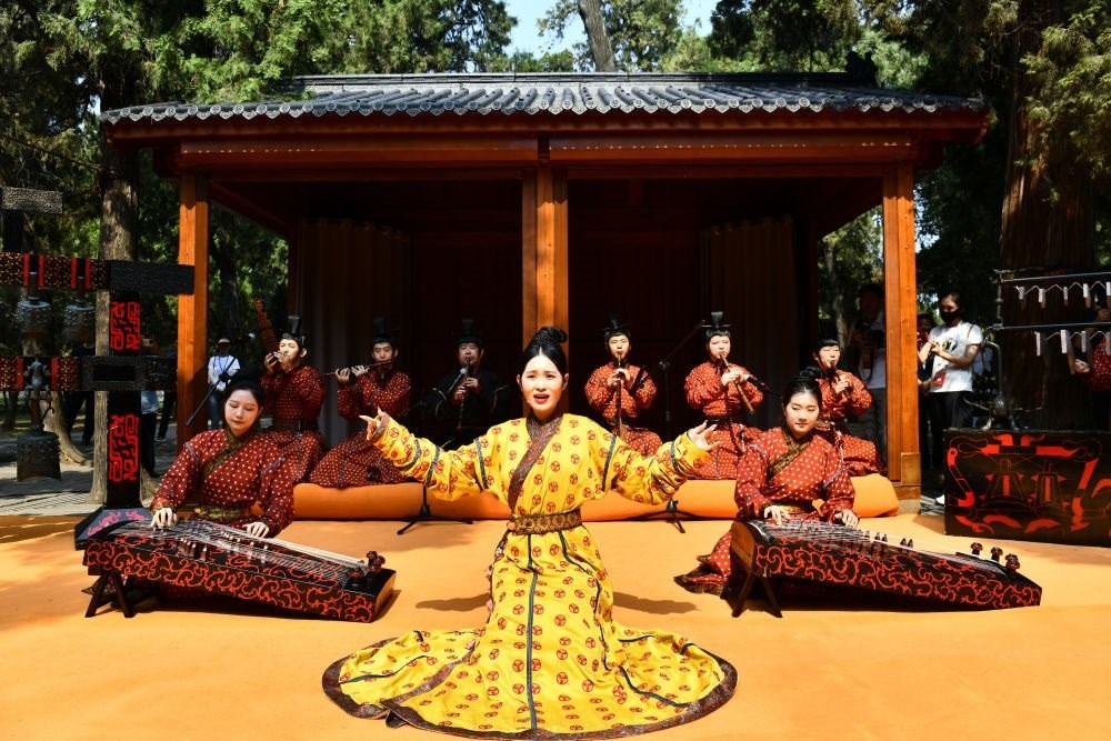 2023年6月27日,在曲阜孔廟,孔子博物館禮樂傳習所的工作人員進行以《詩經》為主題的雅樂表演。新華社記者 郭緒雷 攝