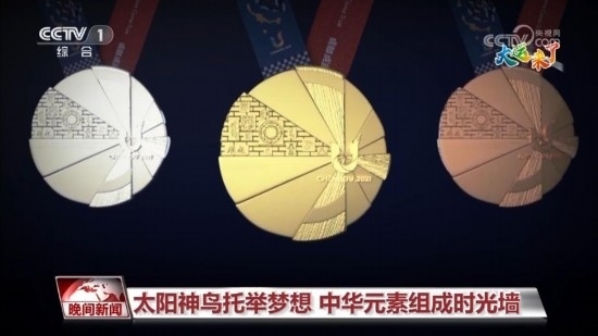 再來看圖案。獎(jiǎng)牌正面設(shè)計(jì)賦予“太陽神鳥”羽翼幾何感,與賽會(huì)會(huì)徽“U”呼應(yīng),猶如神鳥振翅欲飛,寓意守護(hù)夢(mèng)想,自信昂揚(yáng),飛往多彩未來。同時(shí),在幾何扇面嵌入一塊包含多種中華文明代表元素為底紋的絢麗時(shí)光墻,以呈現(xiàn)中國五千年文明的璀璨輝煌和演變歷史。
