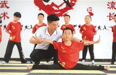 暑假期間,貴州省貴陽市開陽縣青少年學生校外活動中心免費開辦少兒武術班,吸引當地愛好武術的孩子參加學習。圖為7月18日,在少兒武術班,孩子們在老師的指導下練習武術動作。袁福洪攝(人民圖片)