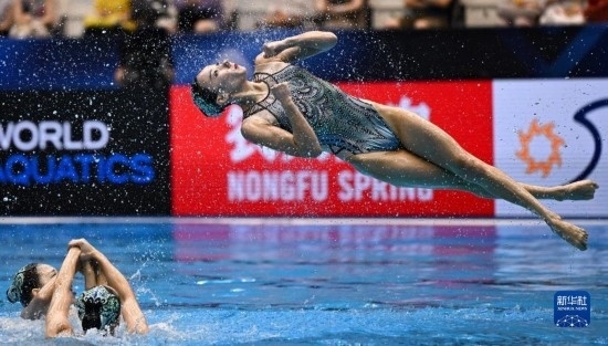 7月21日,中國隊在比賽中。當(dāng)日,在日本福岡舉行2023年世界游泳錦標(biāo)賽花樣游泳集體自由自選決賽中,中國隊以329.1687分的成績獲得冠軍。新華社記者 夏一方 攝