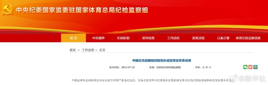 中國足球協(xié)會(huì)技術(shù)部部長譚海涉嫌嚴(yán)重違紀(jì)違法,目前正接受中央紀(jì)委國家監(jiān)委駐國家體育總局紀(jì)檢監(jiān)察組和湖北省監(jiān)委審查調(diào)查。中國足球協(xié)會(huì)戰(zhàn)略規(guī)劃部部長戚軍涉嫌嚴(yán)重違紀(jì)違法,目前正接受中央紀(jì)委國家監(jiān)委駐國家體育總局紀(jì)檢監(jiān)察組和湖北省監(jiān)委審查調(diào)查。(中央紀(jì)委國家監(jiān)委駐國家體育總局紀(jì)檢監(jiān)察組)