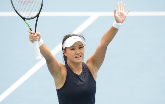 8月6日,中國隊(duì)選手郭涵煜在獲得網(wǎng)球女單冠軍后慶祝勝利。新華社記者 江宏景 攝