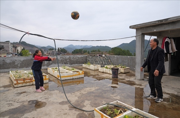 3月27日,李文文在屋頂露臺(tái)和父親玩投籃游戲。李文文是貴州臺(tái)江縣臺(tái)盤鄉(xiāng)中心小學(xué)的女籃隊(duì)長(zhǎng),以前他的父親在外地務(wù)工,如今火爆全網(wǎng)的“美麗鄉(xiāng)村”籃球聯(lián)賽給臺(tái)盤鄉(xiāng)帶來了人氣,父親在家門口就能找到工作。