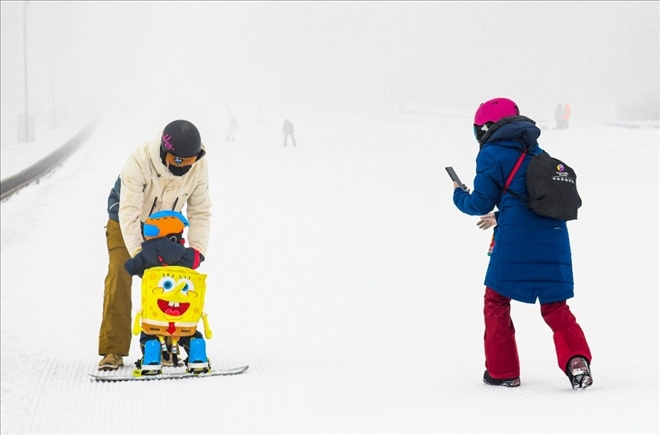 在新疆白云國(guó)際滑雪場(chǎng),許秀娟(右)在給愛人和兒子拍照。哈爾濱人許秀娟曾是專業(yè)運(yùn)動(dòng)員,代表國(guó)家隊(duì)拿過國(guó)際大賽獎(jiǎng)牌。退役后她來到新疆,在這里她和愛人相識(shí),一起開辦培訓(xùn)機(jī)構(gòu),面向青少年推廣冰雪運(yùn)動(dòng)。