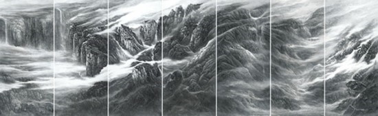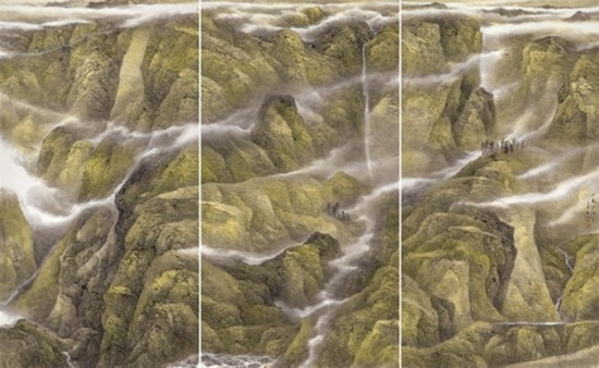 來自上海并深受海派畫學(xué)影響的樂震文、張弛,在宋元及明清山水畫學(xué)上打下了深厚的功底,也因此,他們的傳統(tǒng)山水畫深受日本民眾的歡迎。他們曾游居?xùn)|瀛多年,轉(zhuǎn)道再度研習(xí)了中國傳統(tǒng)文人畫。但真正改變他們畫風(fēng)的,卻是他們對中國北方大山大水的寫生攬勝。他們鐘情于英雄的太行山,忘情于革命勝地陜北高原,力求通過壯闊雄渾的山巒、連綿逶迤的群峰來表達(dá)他們的時(shí)代感悟,營構(gòu)儲存于他們胸中的山川氣象。所謂“山河回聲”,正是這些作品抒發(fā)的中華民族歷經(jīng)歲月風(fēng)華在大好河山之中回響的奮斗激情。