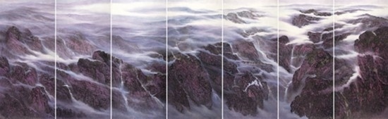 且看樂震文的《直上浮云》《云卷云舒》和《黃土馳風(fēng),日月星辰》,那逶迤茫茫的群山峻嶺,那縱橫畫面的云蒸霞蔚,那連綿不絕的箭樓城堞,哪里還是傳統(tǒng)文人山水畫的淡煙輕嵐,縹緲冷逸?濃縮于畫內(nèi)的精神意蘊(yùn),分明凸顯了現(xiàn)代山水畫對家國情懷的抒發(fā)。且讀張弛的《云起疊嶂》《惟余莽莽》和《紫氣氤氳》,那天光紫氣的浩渺煙云,那渾然一體的山水氣象,那千回百轉(zhuǎn)的流水飛泉,其實(shí)早已脫離了對自然山水的寫照,而是她感悟的時(shí)代精神在偌大畫面上的縱橫揮寫、主觀臆造。