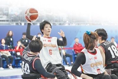 杭州亞殘運(yùn)會(huì)輪椅籃球女子金牌賽,中國體育代表團(tuán)運(yùn)動(dòng)員張雪梅(左二)在比賽中。環(huán)球時(shí)報(bào)記者 崔 萌攝