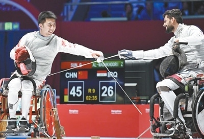杭州亞殘運(yùn)會(huì)輪椅擊劍男子花劍團(tuán)體金牌賽,中國體育代表團(tuán)運(yùn)動(dòng)員孫剛(左)與伊拉克體育代表團(tuán)運(yùn)動(dòng)員友好示意。本報(bào)記者 王 亮攝