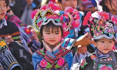 在直苴村“賽裝節(jié)”上,小朋友們身著精美的彝族服飾。田維星攝(影像中國(guó))