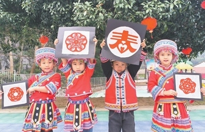湖南省永州市江永縣蘭溪瑤族鄉(xiāng)的孩子們展示剪紙作品,用指尖上的技藝迎接新春佳節(jié)的到來。田如瑞攝(人民視覺)