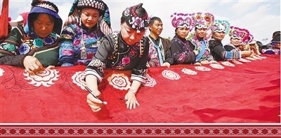 在直苴村“賽裝節(jié)”上,繡娘們正在布匹上勾畫喜慶圖案。何新文攝(影像中國(guó))