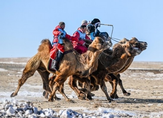 茫茫草原能賽馬,茫茫沙漠就能賽駱駝。2023年底在阿拉善右旗舉行的阿拉善萬峰駝那達(dá)慕大會上,設(shè)置了駱駝短距離速度賽、長距離耐力賽、接力賽等,還有駝球表演賽。按照當(dāng)?shù)啬撩竦恼f法,賽駱駝就得在冬天,因?yàn)槎斓鸟橊勛钇痢?/p>