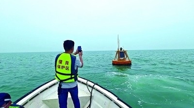 廣西合浦儒艮國家級自然保護(hù)區(qū)工作人員檢查海洋哺乳動物水下聲學(xué)監(jiān)測浮標(biāo)。