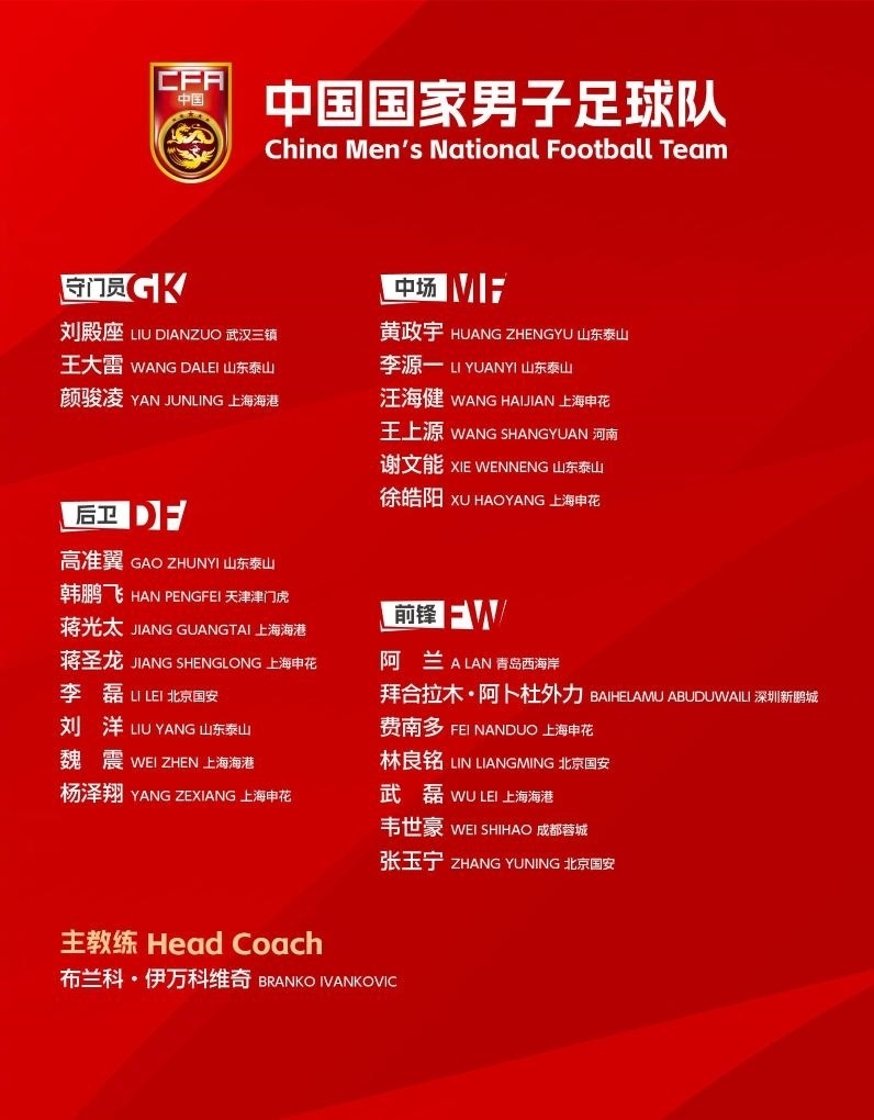 以下為24人大名單:武磊、顏駿凌、蔣光太、魏震(上海海港),王大雷、劉洋、高準(zhǔn)翼、黃政宇、謝文能、李源一(山東泰山),韋世豪(成都蓉城),費(fèi)南多、蔣圣龍、徐皓陽、楊澤翔、汪海?。ㄉ虾I昊ǎ罾凇堄駥?、林良銘(北京國(guó)安),劉殿座(武漢三鎮(zhèn)),韓鵬飛(天津津門虎),王上源(河南),拜合拉木·阿卜杜外力(深圳新鵬城),阿蘭(青島西海岸)。