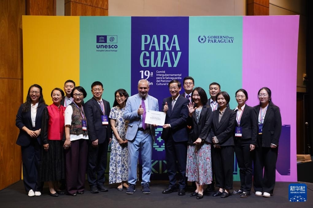 12月5日,在巴拉圭亞松森舉行的聯(lián)合國教科文組織保護(hù)非物質(zhì)文化遺產(chǎn)政府間委員會第19屆常會現(xiàn)場,中國代表上臺領(lǐng)取證書。新華社記者 朱雨博 攝