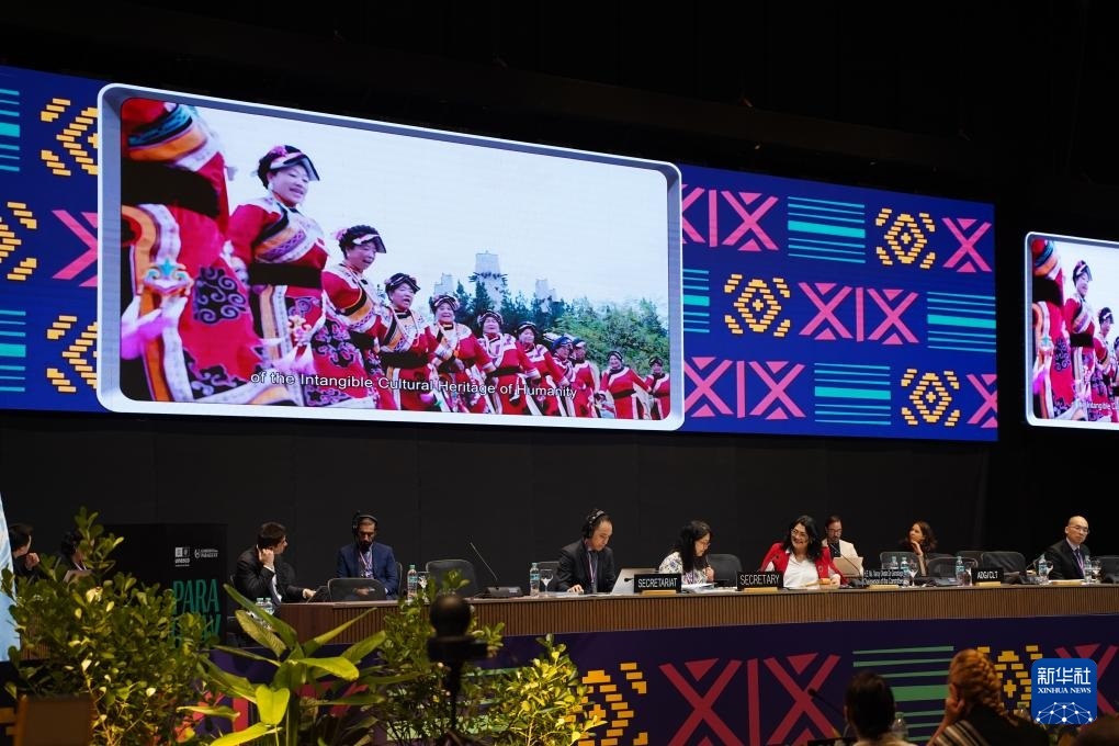 12月5日,在巴拉圭亞松森聯(lián)合國教科文組織保護(hù)非物質(zhì)文化遺產(chǎn)政府間委員會第19屆常會評審現(xiàn)場,大屏幕播放“中國木拱橋傳統(tǒng)營造技藝”宣傳視頻。新華社記者 朱雨博 攝