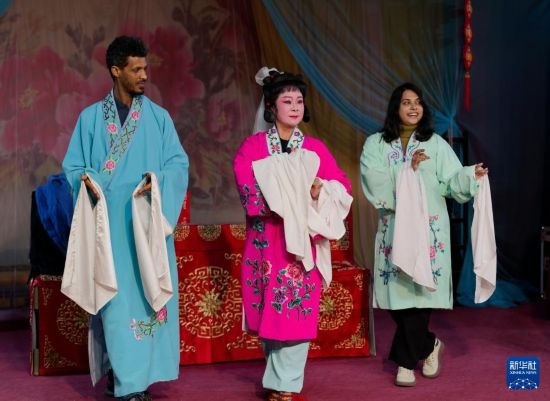 12月8日,游客在官渡古鎮(zhèn)“古渡梨園”體驗(yàn)滇劇表演。