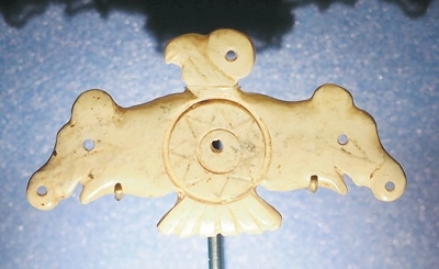 玉鷹是凌家灘文化最具代表性的器物之一。鷹側首傲視,雙翅張開,翅端各為一豬首形象,可能以豬作為財富的象征。鷹腹刻八角星紋,這種紋樣在凌家灘出土的玉版和新石器時代眾多陶器上都有出現。這件玉鷹可能是舉行祭祀儀式時所用之物,鷹、豬、八角星紋集于一器,體現了先民崇尚萬物有靈的宇宙觀。