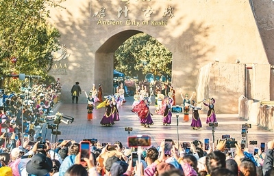 新疆維吾爾自治區(qū)喀什古城景區(qū)舉行形式多樣的文化演出活動,打造演藝品牌,促進文旅融合發(fā)展。圖為游客觀賞古城開城儀式演出。