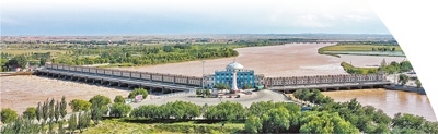 登上三盛公水利樞紐觀景平臺,眼前豁然開朗。黃河宛如一條巨龍,自天際蜿蜒而來,在攔河閘壩的疏導(dǎo)和調(diào)控下,水流變得平緩有序。在這里,黃河被一分為二,一條仍沿主河道逶迤東去,一條則被引入由人工開鑿的總干渠。