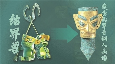 《哪吒2》中的結(jié)界獸與三星堆戴金面罩青銅人頭像。