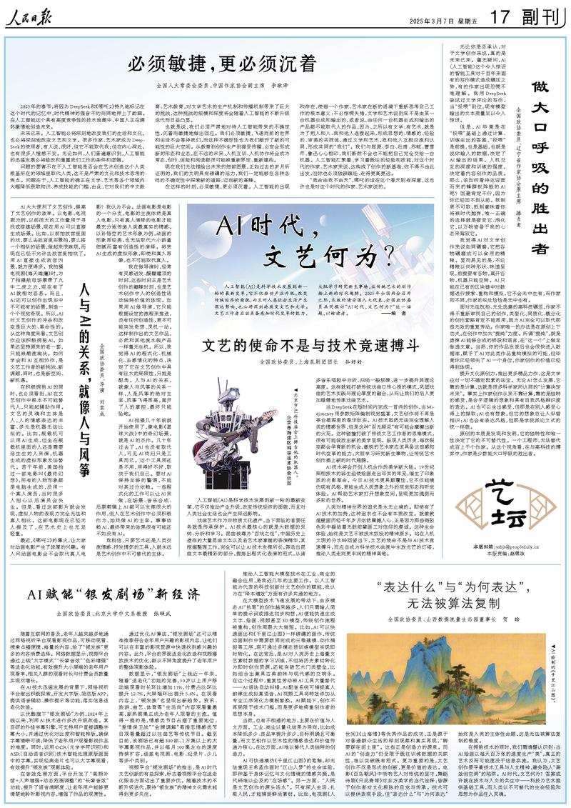 人工智能(AI)是科學技術(shù)發(fā)展到新一輪的最新變革,它不僅推動產(chǎn)業(yè)升級,改變傳統(tǒng)經(jīng)濟的面貌,而且對人類社會生活產(chǎn)生深遠影響,也必將深刻地改變文藝和文學。文藝工作者應該具備感知時代變革的能力,大膽學習研究新生事物,讓傳統(tǒng)藝術(shù)的創(chuàng)作插上新的時代翅膀。2025年全國兩會召開之際,本版約請全國人大代表、全國政協(xié)委員共同探討“AI時代,文藝何為?”這一話題,以饗讀者。