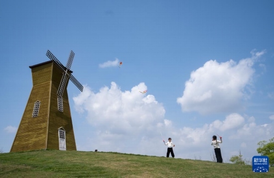 4月6日,在成都西湖公園,兩個(gè)小朋友在草地上放風(fēng)箏。新華社記者 江宏景 攝