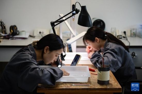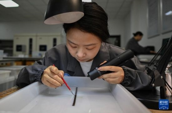 4月24日,荊州文物保護(hù)中心簡(jiǎn)牘工作室工作人員在清理竹簡(jiǎn)。新華社記者 程敏 攝