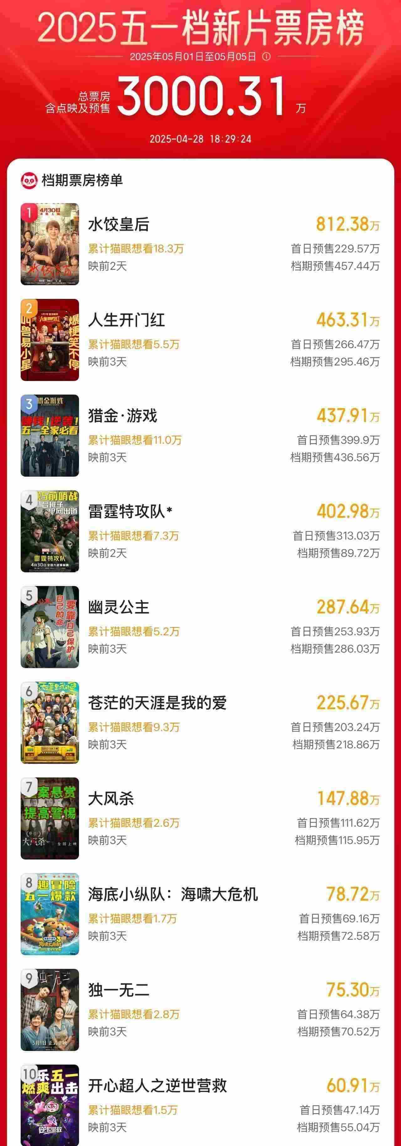 據(jù)網(wǎng)絡平臺數(shù)據(jù),截至4月28日18時29分,2025年“五一”檔新片預售總票房破3000萬,《水餃皇后》《人生開門紅》《獵金·游戲》分列前三位。
