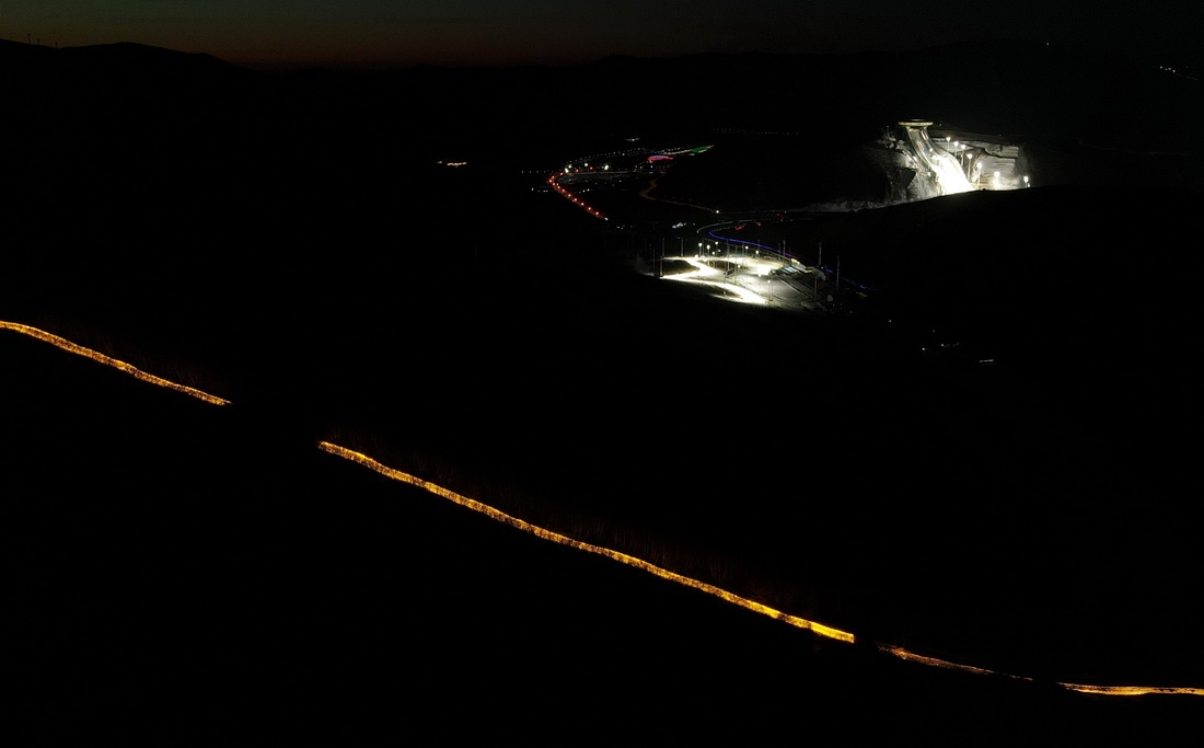 這是12月30日拍攝的崇禮長城景觀展示亮化工程現(xiàn)場,遠處為國家越野滑雪中心和國家跳臺滑雪中心(無人機照片)。新華社記者 楊世堯 攝